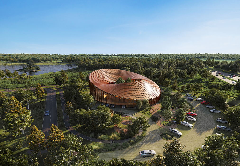 The round shape provides a continuously connected interior experience, while the varying roof height buffers occupants from the noise of the adjacent highway while optimizing views to nature on the opposite side of the building. The form of the roof has been determined by orienting a series of 880 photovoltaic panels, consisting of 11 unique shapes, such that solar radiation potential is optimized for energy production.